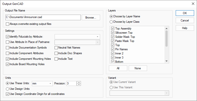 From this dialog, you can choose the name of the output file to be generated. The default for this name is the same as the name of your PCB design, with the file extension for GenCAD files as defined in the Options dialog.