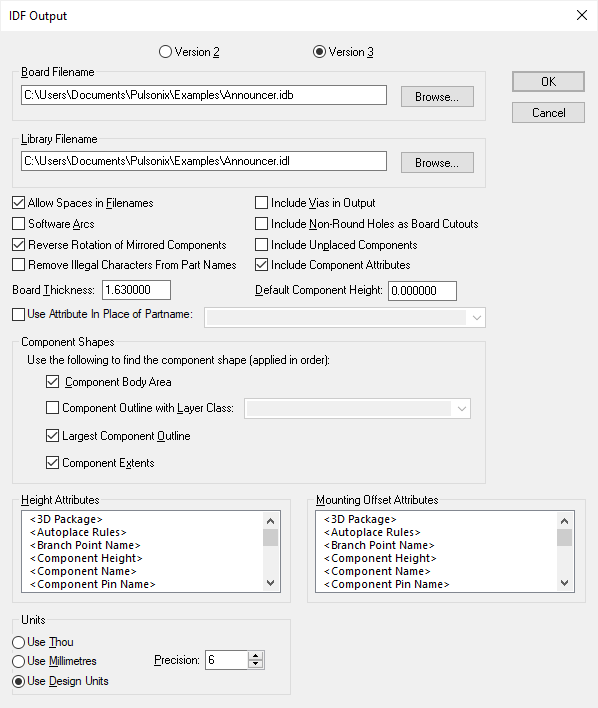 IDF can be output in either Version 2 or Version 3 formats. Most systems will support Version 3 but if your system does not support this then you can use Version 2. The Mounting Offset data is not used in Version 2.
