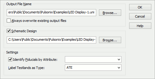 From this dialog, you can choose the name of the output file to be generated. The default for this name is the same as the name of your PCB design, with the file extension for UniDAT files as defined in the Options dialog.