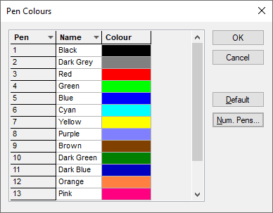 Use the Default button to reset the current list back to the built-in system set of pen numbers and colours. A confirmation dialog is displayed before resetting the list.