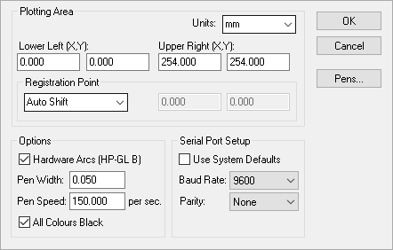 The settings in this section of the dialog are used to define how the serial port is to be driven when plotting directly to your plotter through the serial port.