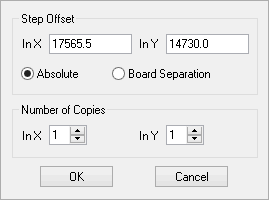 You can step and repeat copies on most plots from within the CAM Plots plotting option. To do this, you must first define the step offset and the number of repeat copies you require. These values are only defined once for a design. You must also set the Step and Repeat option on the plots which you require these values to be applied to.