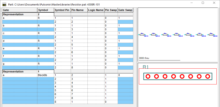 A Part Representation is a set of gates which can be added to a schematic. A Part can have more than one representation. For example, a pack of four gates could be represented by a single top level symbol, or as four individual gates. Each representation is independent of the others. There is no cross checking, so representations do not have to conform to a hierarchical structure, although this is likely to be the case. The first representation is the default, used when a component is first added to a schematic.