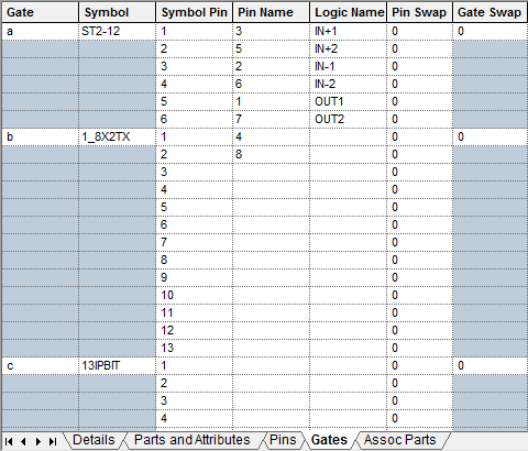 There is one line in this grid for each pin that belongs to a gate in the part. All the pins for each gate are grouped together, as shown below.
