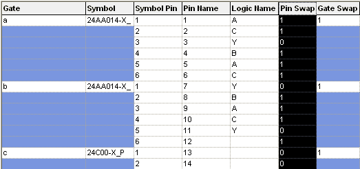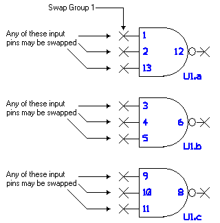 Pins within the same gate with the same Swap Group are considered to be swappable, as are gates with the same Swap Group. A pin or gate with Swap Group set to zero is not swappable.