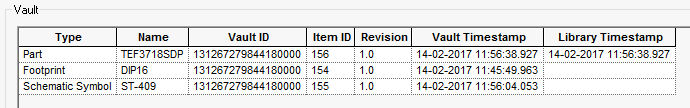 If the Vault is in use, the Vault section will show vault details for the part and its footprint and schematic symbol.