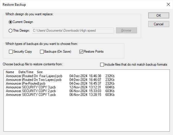 This dialog can be used to restore the current design, or another design that has been located using the Browse button, to a previously saved backup. There are three types of backup, but we are interested here in the restore points. Check only the Restore Points box and a list of the saved restore point files will be presented.
