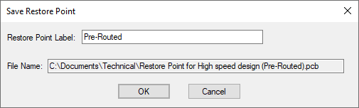 For example, you may wish to save a restore point prior to routing with the tag “pre-routed” so that it is easy to set the design back to that state before routing a different way. You could then save a restore point for each experiment in routing, so that it is easy to set the design back to the preferred result.