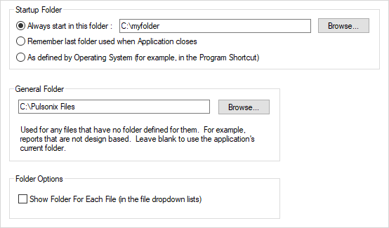 The settings in this section of the dialog specify how the application will select the initial default folder when the program starts.