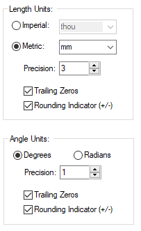 The two areas on this dialog allow you to specify the units used for lengths and coordinates, and the units used to show and enter angles and rotations.