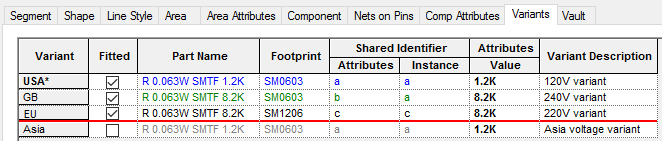 To do this, you need to assign a Shared Identifier (Variant Id), this can be any character or word. There are two columns under the Shared Identifier heading. You can share Attributes by entering the same identifier in the first column, and you can share Instances (symbols) by entering the same identifier in the second column. A blank Id is a valid identifier and initially, by default, all columns are blank indicating the same instance and attributes are shared across all variants. You cannot share attributes without also sharing instances across the same variants. Instances can be shared provided they have compatible parts and footprints in the variants in which they are to be shared.