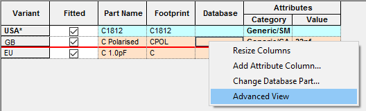 Part Name - This column shows the part used for the current component in that variant. You can use this column to change the part used for this component. Changing the part for a particular variant will also change it for all variants that have the same shared attributes identifier. Double-click in the cell to change the part used by a component. The Change Part dialog will be presented for you to choose the required part. If the chosen part for a particular variant uses a different symbol or footprint to the components part in the current variant, then you will also have to change the shared instance identifier to a different value before updating the spreadsheet.
