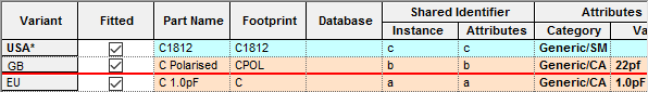 The advantage of using shared identifiers is that where you wish to make a change to the footprint or Attribute for multiple components, provided they use the same shared identifier, you only need to make the change in one entry. For example, if you have a component in four variants and wish two of the four to be the same values but different positions, then having unique instances for the footprint identifiers (Shared Identifier Instance) will allow this configuration.