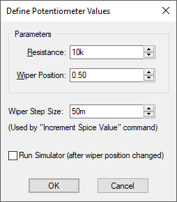The potentiometer wiper position may also be altered using the Increment Spice Value or Decrement Spice Value commands while the device is selected. These default to the shift up and shift down keys. Edit the Wiper Step Size to alter the step size used for this feature.