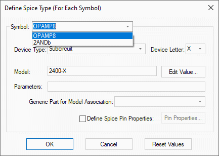 Use Edit Definition to use a specific dialog to easily enter the correct definition on the part to match its symbol. In a schematic design when using Edit Spice Value/Model (or F7) on one of these devices, the same specific definition dialog will be displayed. Changing the definition of the part in a schematic design will replace the part with one from the library matching the new definition.
