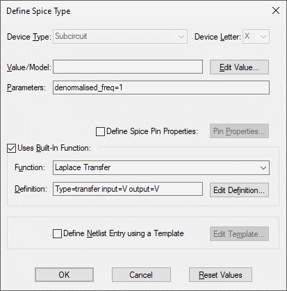 Pulsonix contains many built-in XSpice devices and sub-circuits that have their own specific Edit Value dialogs to make it easier for you to set up the device.