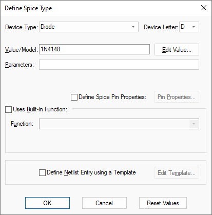 If not using a built-in device, choose the required Spice type by selecting from the Device Type list or from the Device Letter list. This decides the broad category of device to be simulated.