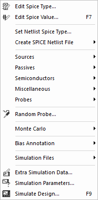Sections in the middle of the menu are used to define Sources, Passive components, Semiconductor components, Miscellaneous items, such as Node Set, Initial conditions, Bias Markers etc, and followed by Probes.