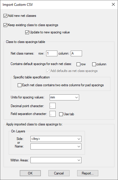 Contains default spacings for each net class Row Column - Some spacing tables contain a special row below the net class names row, or a column to the right of the net class names column, or both, containing default spacing values for each net class. These values do not form part of the class to class spacing values grid, and so the importer needs to know about them so it can skip them, or read the default values from them, to reach the main spacing values grid. Check the row and/or column boxes if you have these values in your table.