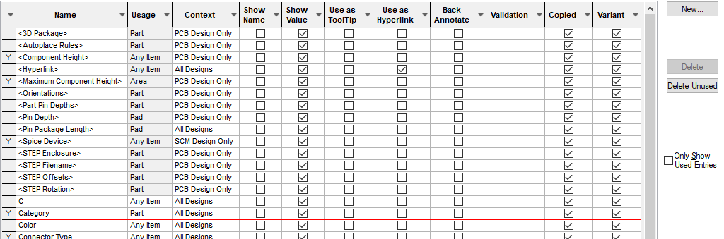 A used Attribute Name cannot be deleted and its Usage and Context status cannot be changed, as this would affect the integrity of the design. The Only Show Used Entries check box in the bottom left of the dialog, allows you to reduce the list to just those which are used.
