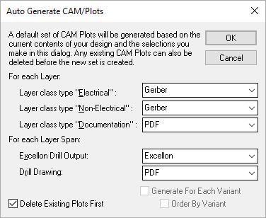The Generate For Each Variant check box is only available if the design has variants. When checked, it will create a plot per defined variant, for each process type that is affected by variants. By default this will be all the non-electrical layers. Order By Variant, when checked, causes the plots to be grouped by variant, otherwise they are grouped by layer first.