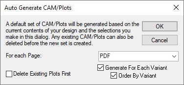 The Generate For Each Variant checkbox is only available if the design has variants. When checked, it will create a plot per defined variant, for each page in the design. Order By Variant, when checked, causes the plots to be grouped by variant, otherwise they are grouped by page first.