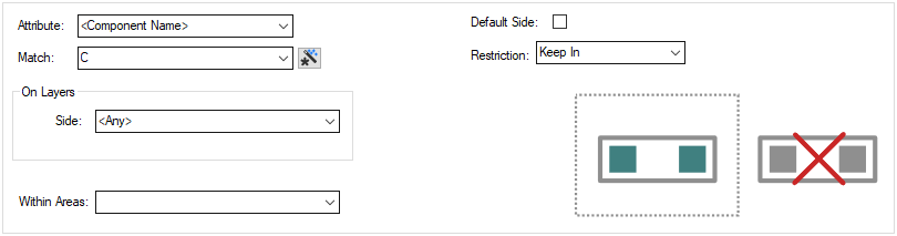 - Keep In Exclusive - matching components must be within a matching area, non matching components must be outside any matching area. This is the same as a Keep In rule for matching components, followed by a Keep Out rule which matches all other components.