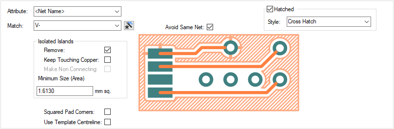 You can define Hatched style to be used with each piece of copper generated. After selecting the Hatched check box, select the Style from the drop down list. Only predefined hatch styles can be selected, these are created using the Hatch Style dialog.