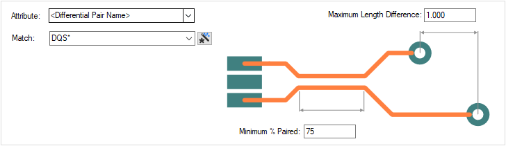 Min % Paired specifies the minimum percentage of the total track length which must be paired. Paired means that it should be parallel and at the gap specified by the Differential Pair Gap rule, or otherwise, the track to track spacing rule. The percentage is calculated using unadjusted lengths (see below for adjustments applied for length difference).