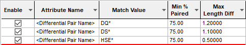 The appropriate skew rule is found for each differential pair by working down the list of rules until the first match is found. Hence, the order of the rules is important. A match is when the specified Attribute Name and Match Value match an attribute of a differential pair, or an attribute on both nets of a differential pair. So the differential pair or nets must have the given attribute, and it’s value must wildcard match the value. In particular, you can match the inbuilt attribute <Differential Pair Name>.