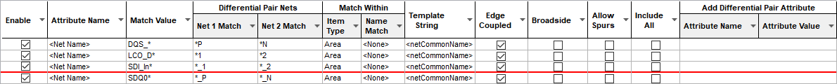 The Match value, Net Name for example, will be the Match criteria use for the rule. You can set this to a specific match, such as SDQ0\* or can be more generic, such as \*. Only nets matching this value will be considered for a differential pair.