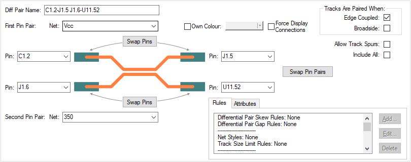 Note: You can define the pin pairs by firstly selecting the two connections that define the pairs in the PCB design. Then, using New will automatically setup the two sets of pins in the dialog. Ensure that the correct pins are selected.