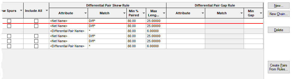 When this dialog is fully expanded, the rules used within the Differential Pairs are displayed. In our example below, we have moved the window across using the slider so that the rules are visible.