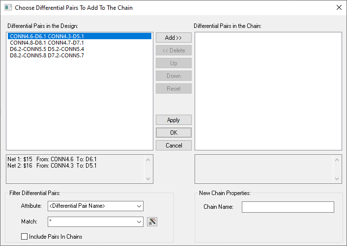 To add the Differential Pair to a Chain, select a Differential Pair from the left side list, it will then highlight blue indicating that you have selected it, click the Add >> button to add the selected Differential Pairs to the Chain. You can use the Ctrl and Shift keys on Pairs to select and deselect them in the list.