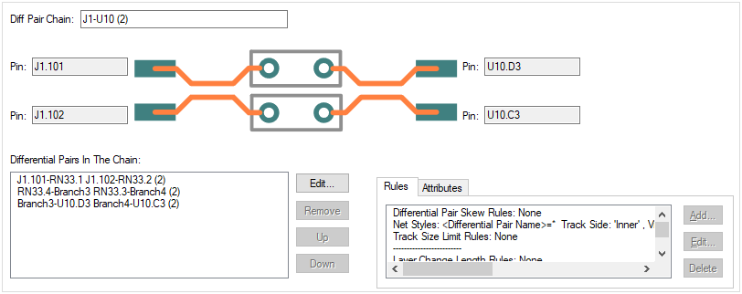 The bottom portion of the dialog provides more details of the Chain and any Rules and Attributes associated with it. As a Differential Pair Chain is a sequence of Differential Pairs, you can define a Skew Rule of the length difference that is applied across the entire Chain and are displayed in the Rules pane. These rules can be checked using the Design Rules Checker.