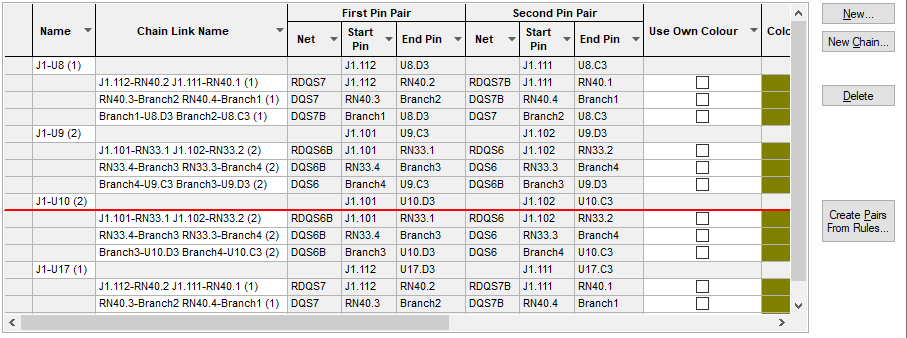 In the grid, the Chain Name now appears left most with the corresponding Differential Pair Names within each Chain indented. To the right of this will be the First Pin Pair and Second Pin Pair plus Net Names of the differential Pairs. Note, the Differential Pair can include a Branch point as well if one is defined for the net.