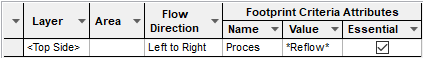 For example, using the attribute method, if the Name column is set to <Process> (Process being the Attribute Name) and the Value is set to Reflow, the system will search for any footprint which has the <Process> attribute defined and contains the word Reflow. The appropriate rule will then be applied to that footprint.