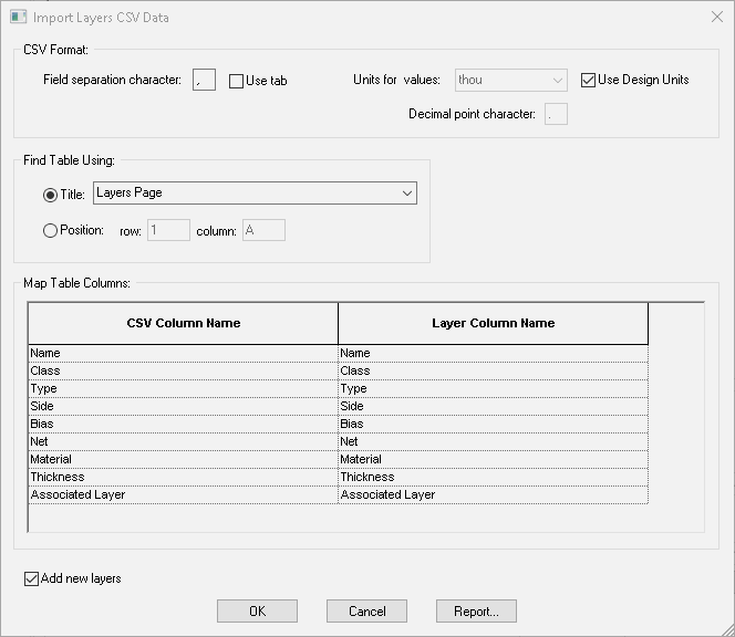 The Add new layers selection will add any new rules if they do not already exist in the layers page. If you uncheck this option, any new layers that exist in the CSV file will be ignored.