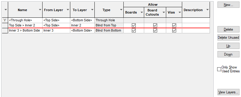 The Layer Spans dialog is used to create and manage defined Layer Spans in the design. A Layer Span defines the possible layers a via can penetrate through the board. Often these are through the board, from the Top to the Bottom Electrical layer.