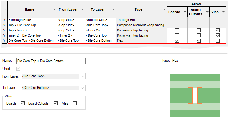 Layer spans are also used for board outlines to create Flexi-Rigid Boards, and for Board Cutout Areas to create Board Cavities.
