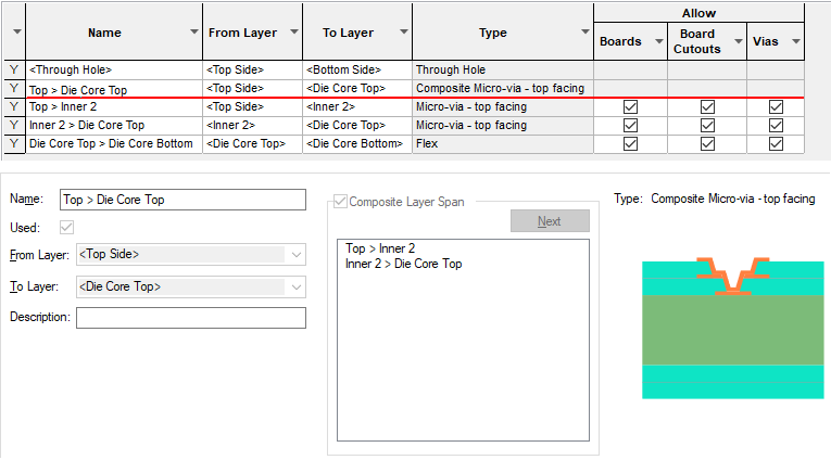 Secondly, define the normal layer spans that will be used to form the composite. In the example below, we have defined two sets of Micro-vias which span Top to Inner 3 and Inner 3 to Inner 4. A composite will then be created from the two span sets. Two in our example but they can be more if spanning more layers.
