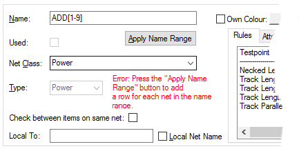 The Apply Name Range button appears and is greyed out on creation of a new Net Name. Name ranges are used to define a number of nets in one go using a simplified naming range. Name Range characters are defined in the Design Settings - Naming dialog. Use a name range if you wish to create multiple net names, such as ADD1, ADD2, ADD3… etc. If you wish to create just one net name, type its name, i.e. CLK or RST.