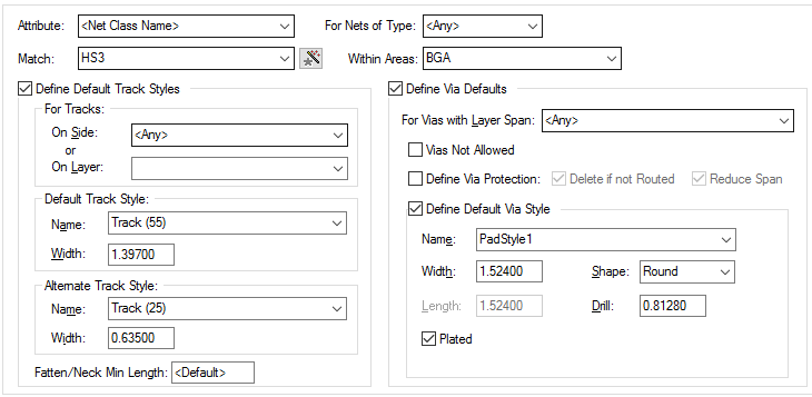 A rule specify the default track styles or the default via styles, or both of these by checking the Define Default Track Styles or the Define Via Defaults boxes.
