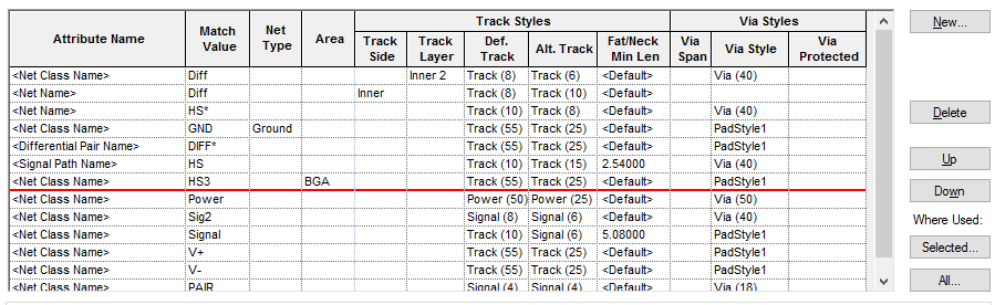 When adding a new track or via to the design, the style to be used is searched for through the Net Styles entries defined in the design, in the order defined in this dialog. The search will continue until a match is found taking into consideration the net, track layer, via layer span and an area name (if within a styles override area).