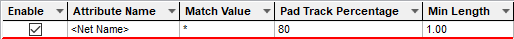The appropriate Pad Track Neck rule is found for each net item by working down the list of rules until the first match is found. Hence, the order of the rules is important. A match is when the specified Attribute Name and Match Value match attributes of a net item. So the Pad Track Neck rule must have the given attribute, and it’s value must wildcard match the value.