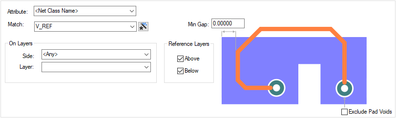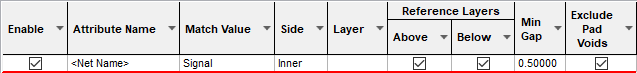 The Return Path Rules dialog is used to define the values needed to ensure there is a continuous signal return path along the reference layers above and/or below matched signals.
