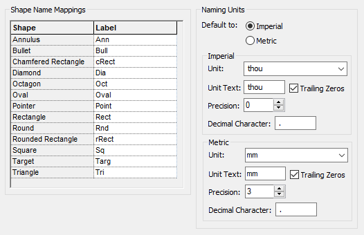 This dialog is available from the Pin Naming Style page and is used to set up Units and Unit Text used within the Pin Style Naming. It is also used to define Shape Naming Mapping.