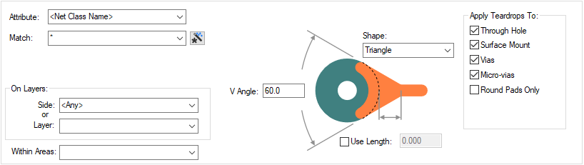 Once enabled, this entry allows you to define the size of the teardrop by its length from the edge of the pad (where the track and pad meet) to then end of the teardrop. The default is 50 thou. The length value must be greater than 0.