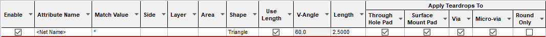 The appropriate teardrop rule is found for each net or pad by working down the list of rules until the first match is found. Hence, the order of the rules is important. A match is when the specified Attribute Name and Match Value match attributes of a net or pad. So the pad (or net) must have the given attribute, and it’s value must wildcard match the value. In particular, you can match the inbuilt attributes <Net Class Name> or <Net Name> to create net specific rules; or <Pad Style Name> to create rules for pads or vias which use matching pad styles. By adding an attribute to a specific pad, you can cause it to receive a different shaped teardrop to all the other pads on the same net.