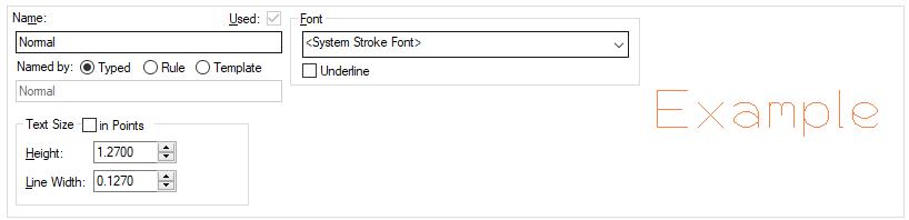 Each line in the grid represents a Style which can be used for any textual item in the design (Text, Attributes, Dimensions, Errors). A Text Style has a Name, a Size, a Line Width, a Font and Underlined state.